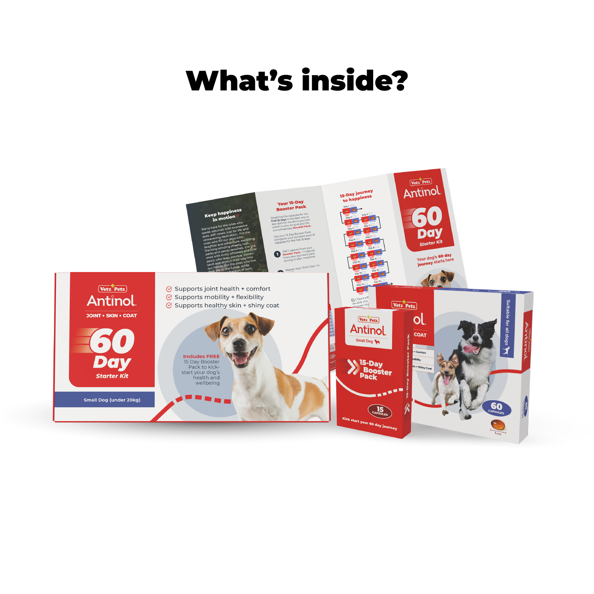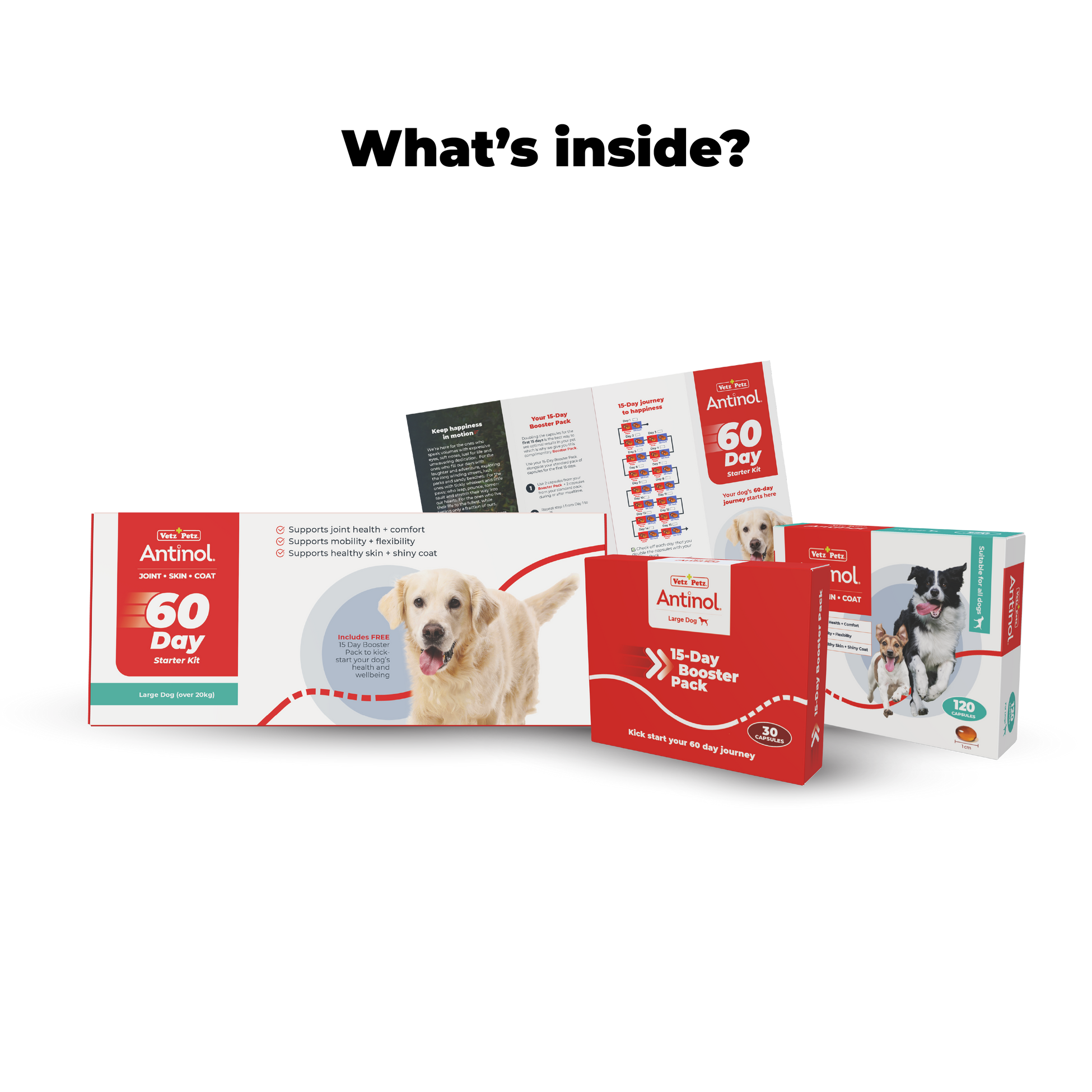This helps rapidly boost the essential fatty acids from Antinol® in your pet's body. Antinol® is clinically proven to support healthy mobility and doubling the number of capsules fed in the first 15 days is an important kick start.