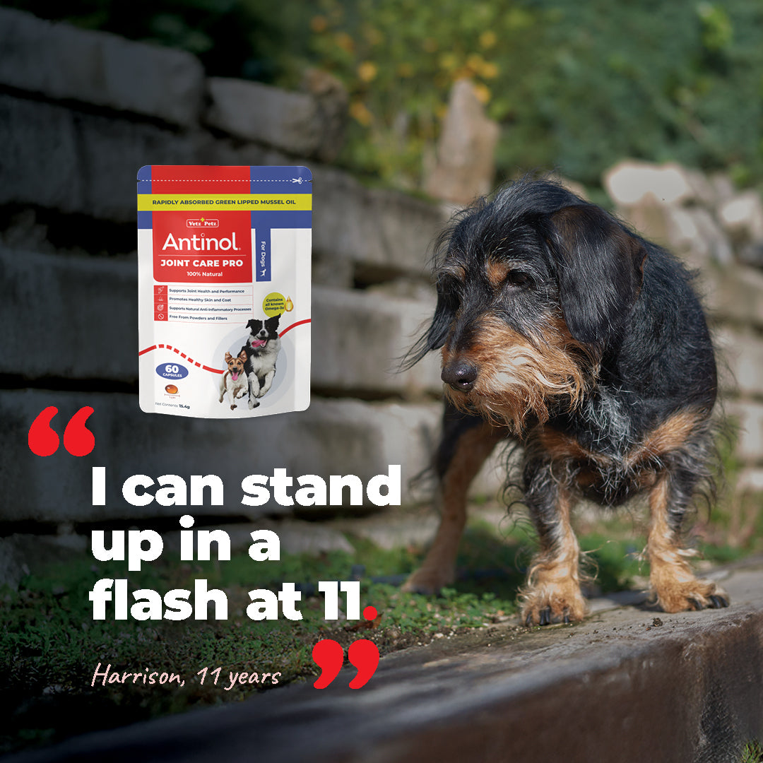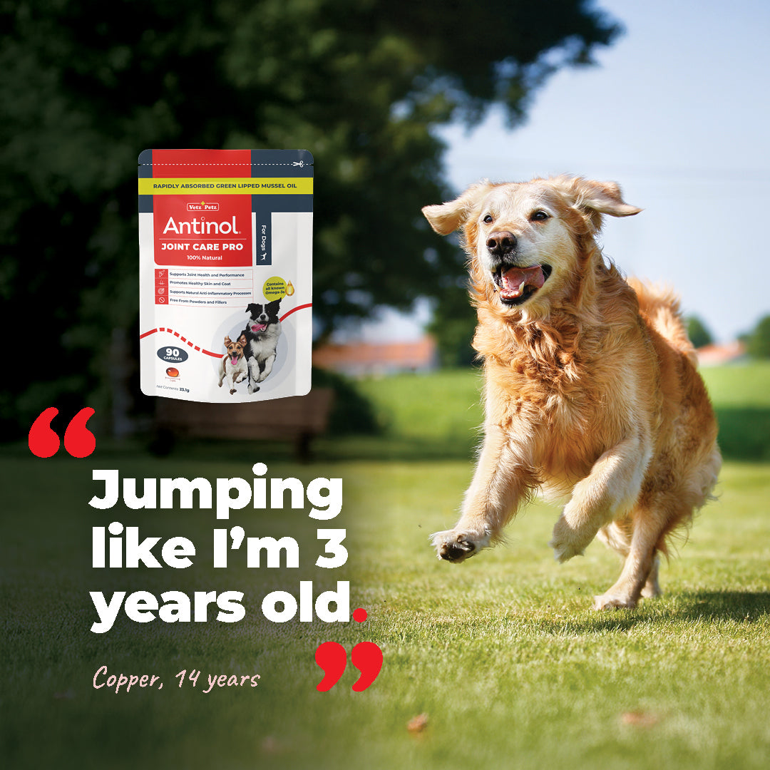 Antinol® Joint Care Pro is a powerful, rapidly absorbed joint, skin and coat supplement. A concentrated green-lipped mussel oil, it contains all known omega-3s, supporting your dog’s joint health and performance whilst maintaining healthy skin and a shiny coat. 100% natural, safe for long-term use and backed by over 25 years of scientific research.